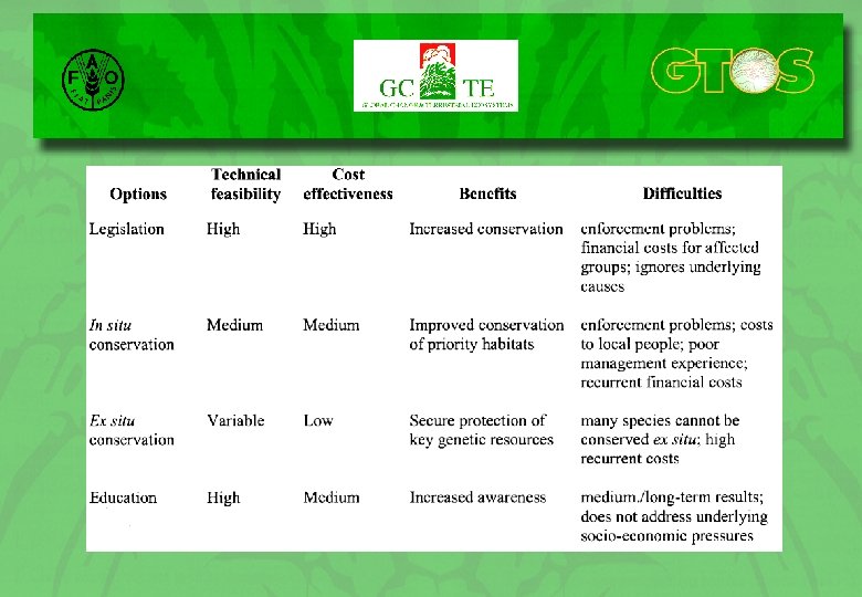 GTOS Conceptual framework ANTHROPOGENIC DRIVERS Land Use/ Land Cover Change Atmospheric Composition Change Climate Change Ecosystem Structure Ecosystem Function ECOSYSTEM CHANGES Wood & Fibre RESOURCE & PRODUCT AVAILABILITY Food Water Genes, Species, Habitats Air Trans Boundary Air Pollution Resource Supply Constraints Land Degradation & Desertification Pollution & Competition in Shared Waterbasins Loss of Biodiversity Costal Zone Pollution GLOBAL CHANGE & SUSTAINABILITY ISSUES GTOS planning group expert 1996