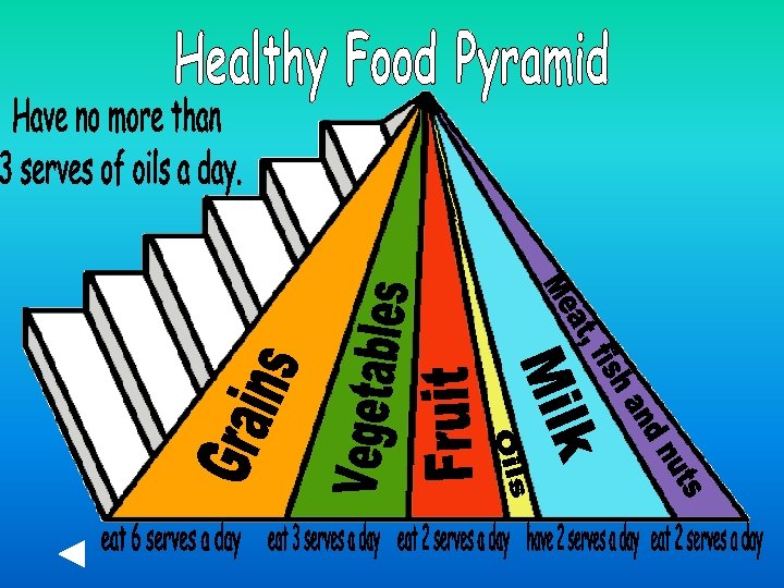 In order to remain healthy, we should eat a balanced diet. This means we should eat a variety of foods. Food can be sorted into several groups – fruit, vegetables, meat, fish and nuts, dairy and grains. vegetables meat, fish and beans milk fruit snack foods healthy food pyramid grains fast foods