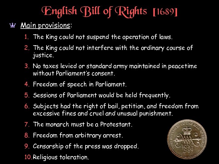 English Bill of Rights [1689] a Main provisions: 1. The King could not suspend the operation of laws. 2. The King could not interfere with the ordinary course of justice. 3. No taxes levied or standard army maintained in peacetime without Parliament’s consent. 4. Freedom of speech in Parliament. 5. Sessions of Parliament would be held frequently. 6. Subjects had the right of bail, petition, and freedom from excessive fines and cruel and unusual punishment. 7. The monarch must be a Protestant. 8. Freedom from arbitrary arrest. 9. Censorship of the press was dropped. 10. Religious toleration.