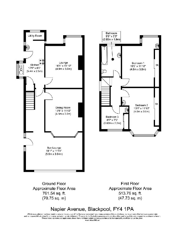 Description The property briefly comprises a spacious, three bedroom semi-detached house which is in close walking distance to the Promenade. The property has easy access to local shops and other amenities. The property benefits from a large sun lounge extension to the front, double glazing throughout and gas central heating. Accommodation The accommodation briefly comprises; To the Ground Floor Access through side Entrance Hallway incorporating radiator and storage heater. Sun Lounge (front) 5. 5 m x 3. 64 m, with radiator and a large PVCu picture window, wall and ceiling lighting. Kitchen (middle) 5. 4 m (maximum dimensions) x 2. 5 m, incorporating floor units, stainless steel sink unit, electric cooker, gas hob, radiator, storage heater, tiled splash backs, separate wash basin, PVCu windows and door with side access to the rear garden. Access through to the Utility room. Utility Room (rear) off Kitchen, plumbing for washing machine, Icos gas boiler, PVCu window. Lounge (rear) 4. 9 m (to bay) x 3. 6 m, incorporating a gas fire, TV aerial and radiator, PVCu window. Dining Room (middle) 3. 6 m x 4. 1 m (to bay), with bay window, radiator, tiled fire place feature. First Floor comprises: - Landing large PVCu window off staircase. Bedroom 1 (rear) 4. 8 m (to bay) x 3. 6 m (including wardrobes), Double bedroom with extensive fitted wardrobes, radiator, vanity unit and PVCu window. Bedroom 2 (front) 4 m (to bay) x 3. 6 m (including wardrobes), double bedroom, large bay window, extensive fitted wardrobes, vanity unit and PVCu window. Bedroom 3 (front) 2. 62 m x 2. 2 m (including wardrobes), vanity unit, radiator, fitted wardrobes and PVCu window. Bathroom (rear) 2. 96 m x 1. 9 m, three piece suite including large feature bath with shower head, wash basin and WC with heated towel rail, radiator, tiled walls and shaver point, PVCu window. Externally There is a small forecourt garden area to the front with on street parking available. There is a large patio garden area to the rear of the property incorporating a large garage. Garage (rear) electricity and lighting available. Tenure We understand that the property is held Freehold and free from any ground or chief rent. Council Tax The property is assessed in Band C for Council Tax purposes. Services It is understood that all mains services are either connected to the property or are available within Napier Avenue. Negotiations Further information or viewings and negotiations will be conducted strictly through the sole selling agent Michael Cuddy. Price: £ 144, 950 Subject to Contract May 2014 Misrepresentation Michael Cuddy, Chartered Surveyors for themselves and for the vendors or lessors of this property whose agents they are give notice that (i) the particulars are set out as a general outline only for the guidance of intended purchasers or lessees, and do not constitute, nor constitute part of, an offer or contract; (ii) all descriptions, dimensions, reference to condition and necessary permissions for use and occupation, and other details are given without responsibility and any intending purchasers or tenants should not rely on them as statements or representations of fact but must satisfy themselves by inspection or otherwise as to the correctness of each of them; (iii) None of the appliances nor service installations have been tested and their condition is not known. (iv) no person in the employment of Michael Cuddy, Chartered Surveyors has any authority to make or give any representation or warranty whatever in relation to this property. 290 Church Street Blackpool Lancs FY 1 3 QA agency@michaelcuddy. co. uk www. michaelcuddy. co. uk Mob: 075577 32894 Tel: (01253) 751616