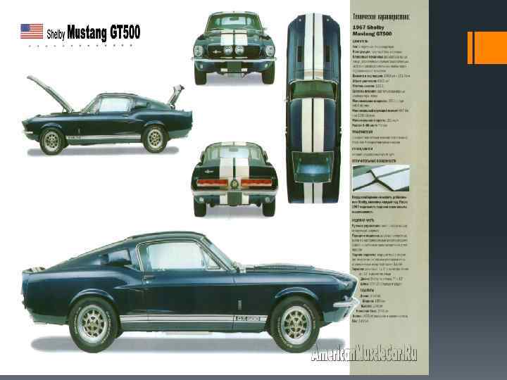 Первое поколение (1964— 1973) Первый Mustang покинул конвейер утром 9 марта 1964 года, а к концу этого же года было продано 263 434 машины. В середине 1965 года была представлена модель в кузове фастбэк, нацеленная против конкурентной модели Plymouth Barracuda и выглядящая гармоничнее базового купе. Очень привлекателен внешне был и автомобиль с кузовом convertible (кабриолет). В качестве основы дизайна был использован стилистический «ключ» удачного люксового купе Континенталь Марк II середины пятидесятых годов, с его характерными пропорциями с длинным капотом и коротким багажником и пластикой боковины кузова с изломом в районе арки заднего колеса. Однако, по сравнению с ним внешность «Мустанга» была менее строгой и более динамичной. Дизайн считался для своего времени весьма удачным, хотя и нетрадиционным для Америки — высказывались даже мнения, что в этом отношении «Мустанг» с его чистыми линиями относительно компактного кузова и умеренным количеством хрома в отделке был ближе к европейским, а не к массовым американским моделям тех лет с характерными для них избыточными размерами и излишним увлечением блестящими орнаментами.