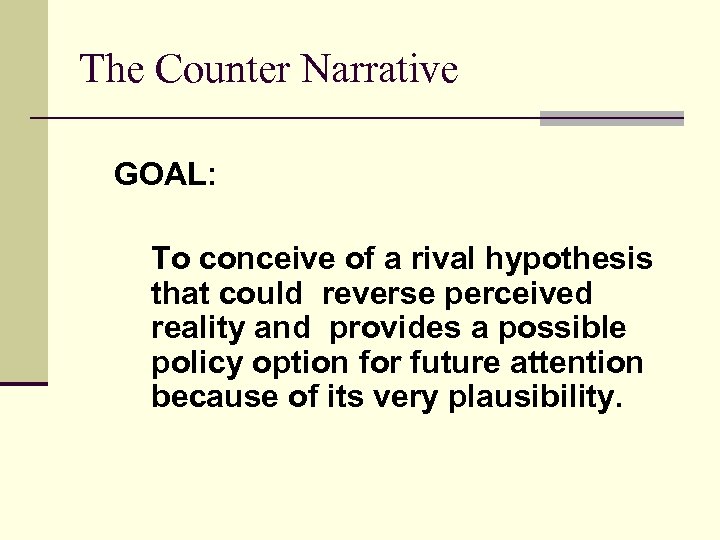 The Counter Narrative GOAL: To conceive of a rival hypothesis that could reverse perceived reality and provides a possible policy option for future attention because of its very plausibility.