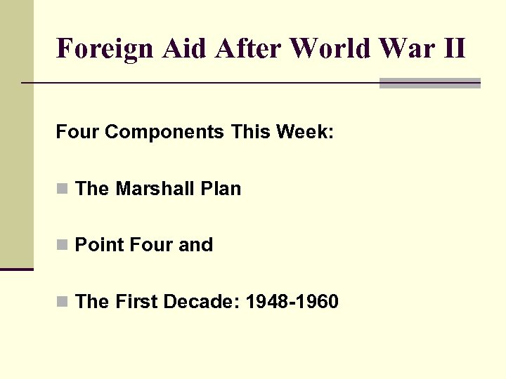 Foreign Aid After World War II Four Components This Week: n The Marshall Plan n Point Four and n The First Decade: 1948 -1960