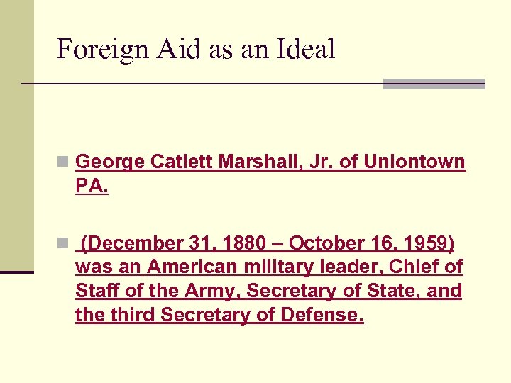 Foreign Aid as an Ideal n George Catlett Marshall, Jr. of Uniontown PA. n (December 31, 1880 – October 16, 1959) was an American military leader, Chief of Staff of the Army, Secretary of State, and the third Secretary of Defense.