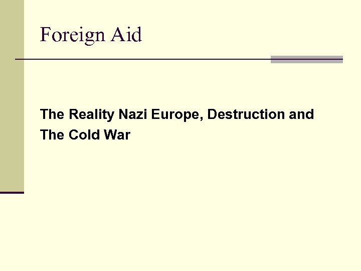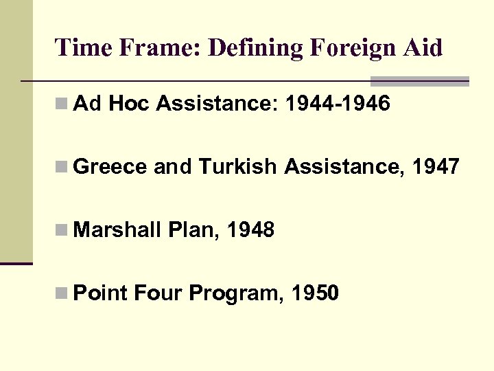 Time Frame: Defining Foreign Aid n Ad Hoc Assistance: 1944 -1946 n Greece and Turkish Assistance, 1947 n Marshall Plan, 1948 n Point Four Program, 1950