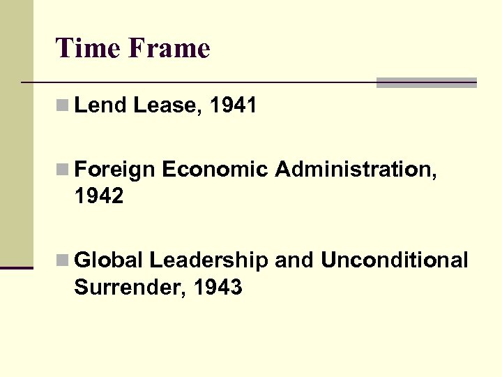 Time Frame n Lend Lease, 1941 n Foreign Economic Administration, 1942 n Global Leadership and Unconditional Surrender, 1943