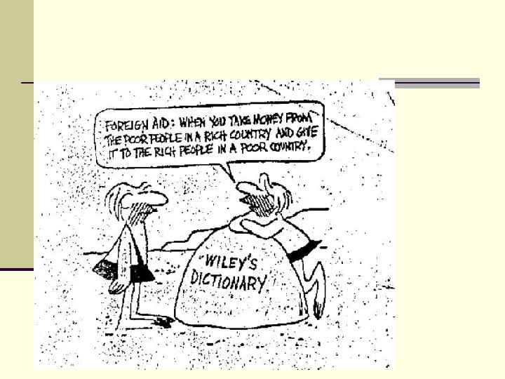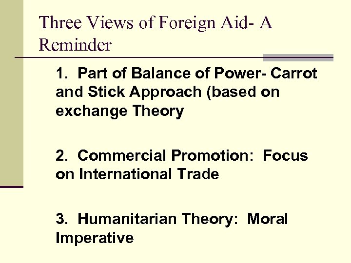 Three Views of Foreign Aid- A Reminder 1. Part of Balance of Power- Carrot and Stick Approach (based on exchange Theory 2. Commercial Promotion: Focus on International Trade 3. Humanitarian Theory: Moral Imperative