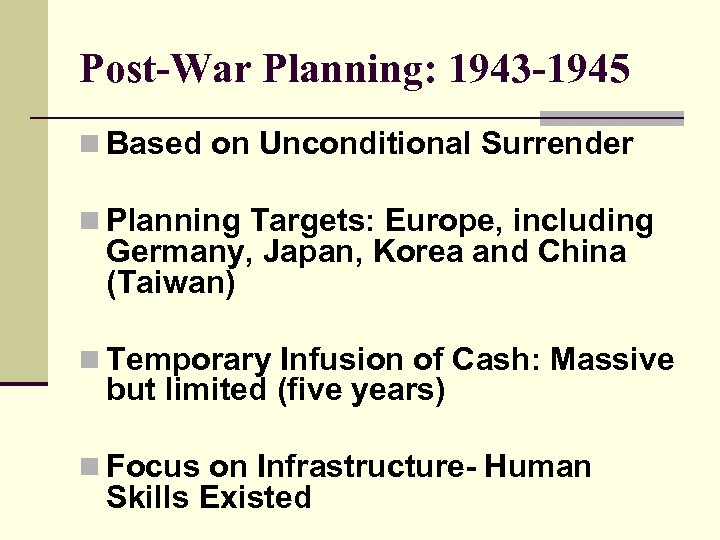 Post-War Planning: 1943 -1945 n Based on Unconditional Surrender n Planning Targets: Europe, including Germany, Japan, Korea and China (Taiwan) n Temporary Infusion of Cash: Massive but limited (five years) n Focus on Infrastructure- Human Skills Existed