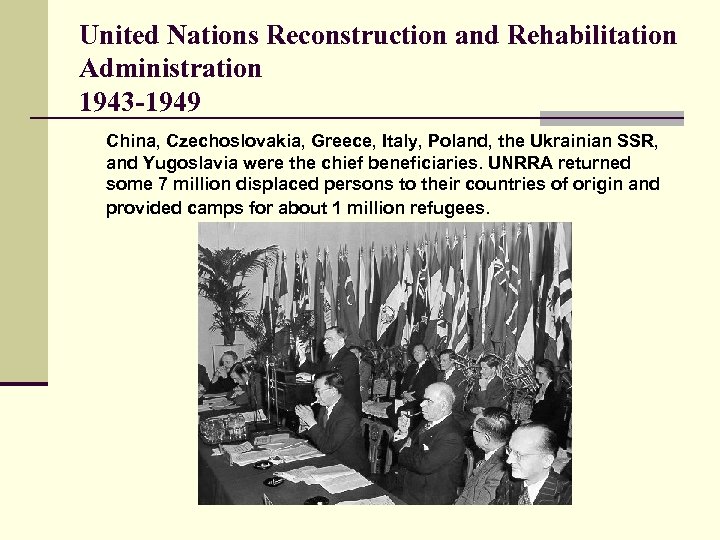 United Nations Reconstruction and Rehabilitation Administration 1943 -1949 China, Czechoslovakia, Greece, Italy, Poland, the Ukrainian SSR, and Yugoslavia were the chief beneficiaries. UNRRA returned some 7 million displaced persons to their countries of origin and provided camps for about 1 million refugees.