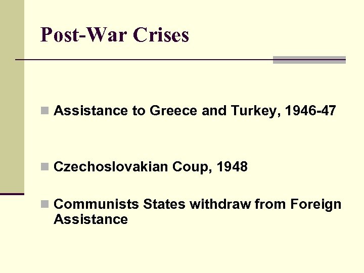 Post-War Crises n Assistance to Greece and Turkey, 1946 -47 n Czechoslovakian Coup, 1948 n Communists States withdraw from Foreign Assistance