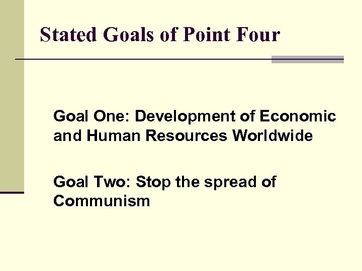 Stated Goals of Point Four Goal One: Development of Economic and Human Resources Worldwide Goal Two: Stop the spread of Communism