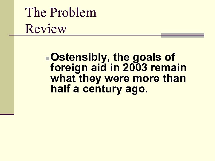 The Problem Review n Ostensibly, the goals of foreign aid in 2003 remain what they were more than half a century ago.