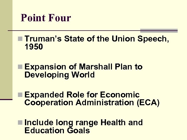 Point Four n Truman’s State of the Union Speech, 1950 n Expansion of Marshall Plan to Developing World n Expanded Role for Economic Cooperation Administration (ECA) n Include long range Health and Education Goals