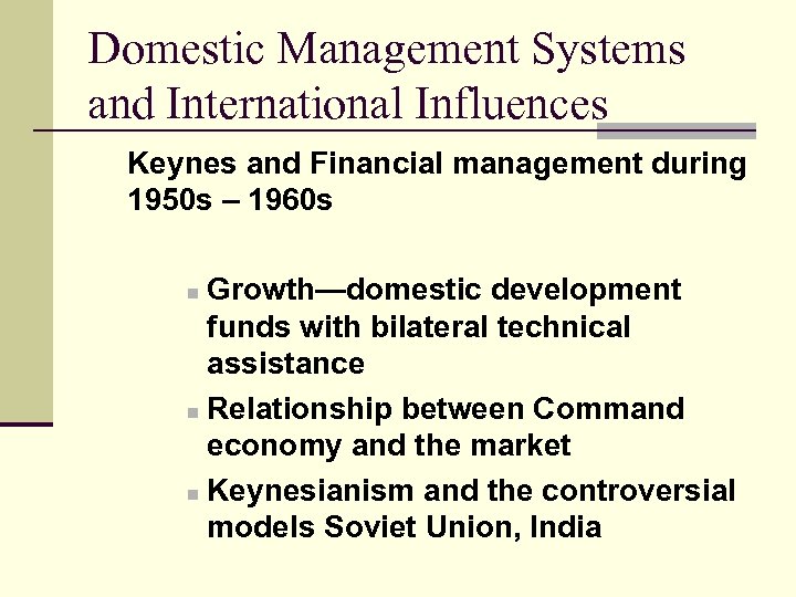 Domestic Management Systems and International Influences Keynes and Financial management during 1950 s – 1960 s Growth—domestic development funds with bilateral technical assistance n Relationship between Command economy and the market n Keynesianism and the controversial models Soviet Union, India n