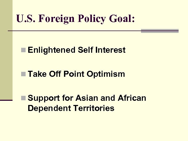 U. S. Foreign Policy Goal: n Enlightened Self Interest n Take Off Point Optimism n Support for Asian and African Dependent Territories