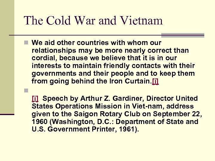 The Cold War and Vietnam n We aid other countries with whom our relationships may be more nearly correct than cordial, because we believe that it is in our interests to maintain friendly contacts with their governments and their people and to keep them from going behind the Iron Curtain. [i] n [i] Speech by Arthur Z. Gardiner, Director United States Operations Mission in Viet-nam, address given to the Saigon Rotary Club on September 22, 1960 (Washington, D. C. : Department of State and U. S. Government Printer, 1961).
