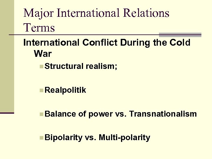 Major International Relations Terms International Conflict During the Cold War n Structural realism; n Realpolitik n Balance of power vs. Transnationalism n Bipolarity vs. Multi-polarity