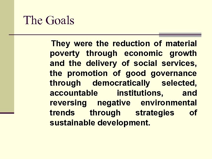 The Goals They were the reduction of material poverty through economic growth and the delivery of social services, the promotion of good governance through democratically selected, accountable institutions, and reversing negative environmental trends through strategies of sustainable development.