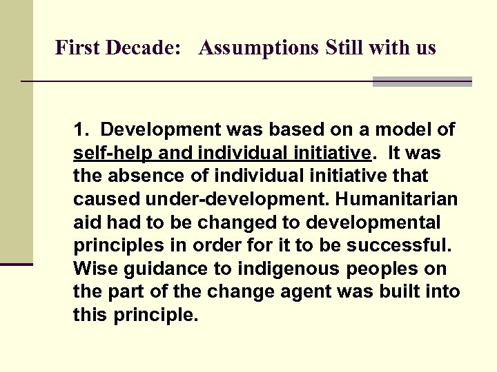 First Decade: Assumptions Still with us 1. Development was based on a model of self-help and individual initiative. It was the absence of individual initiative that caused under-development. Humanitarian aid had to be changed to developmental principles in order for it to be successful. Wise guidance to indigenous peoples on the part of the change agent was built into this principle.