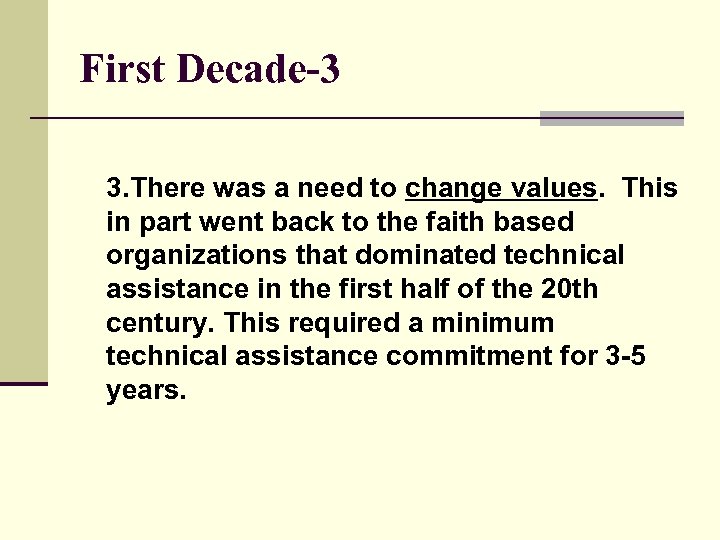 First Decade-3 3. There was a need to change values. This in part went back to the faith based organizations that dominated technical assistance in the first half of the 20 th century. This required a minimum technical assistance commitment for 3 -5 years.