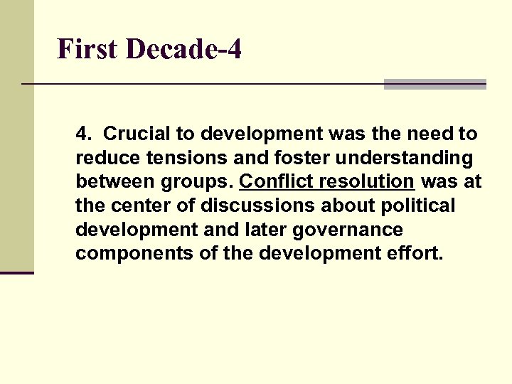 First Decade-4 4. Crucial to development was the need to reduce tensions and foster understanding between groups. Conflict resolution was at the center of discussions about political development and later governance components of the development effort.