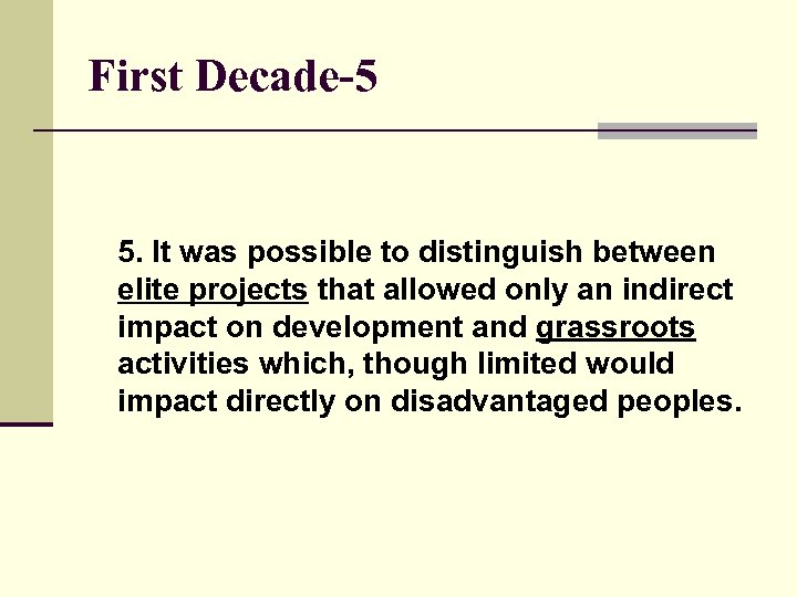 First Decade-5 5. It was possible to distinguish between elite projects that allowed only an indirect impact on development and grassroots activities which, though limited would impact directly on disadvantaged peoples.
