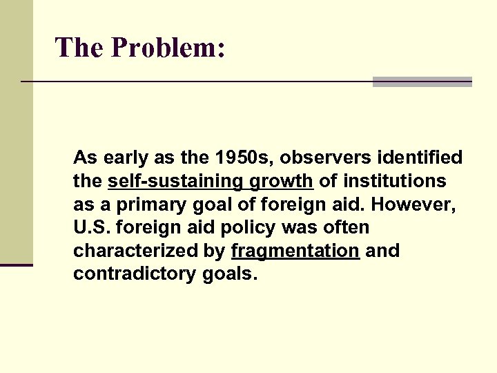 The Problem: As early as the 1950 s, observers identified the self-sustaining growth of institutions as a primary goal of foreign aid. However, U. S. foreign aid policy was often characterized by fragmentation and contradictory goals.