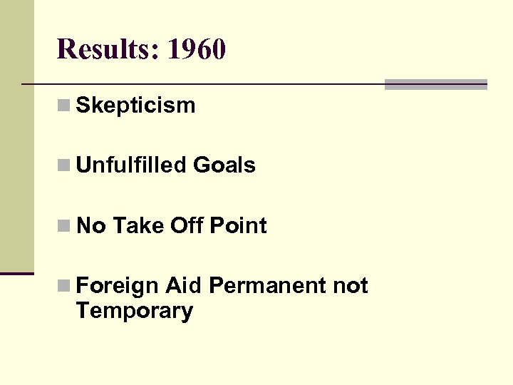 Results: 1960 n Skepticism n Unfulfilled Goals n No Take Off Point n Foreign Aid Permanent not Temporary