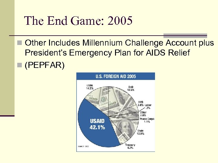 The End Game: 2005 n Other Includes Millennium Challenge Account plus President’s Emergency Plan for AIDS Relief n (PEPFAR)