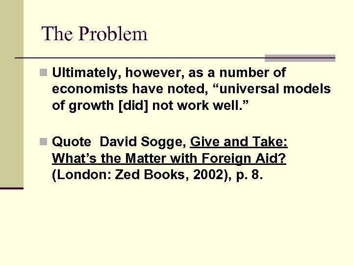 The Problem n Ultimately, however, as a number of economists have noted, “universal models of growth [did] not work well. ” n Quote David Sogge, Give and Take: What’s the Matter with Foreign Aid? (London: Zed Books, 2002), p. 8.