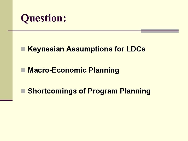 Question: n Keynesian Assumptions for LDCs n Macro-Economic Planning n Shortcomings of Program Planning