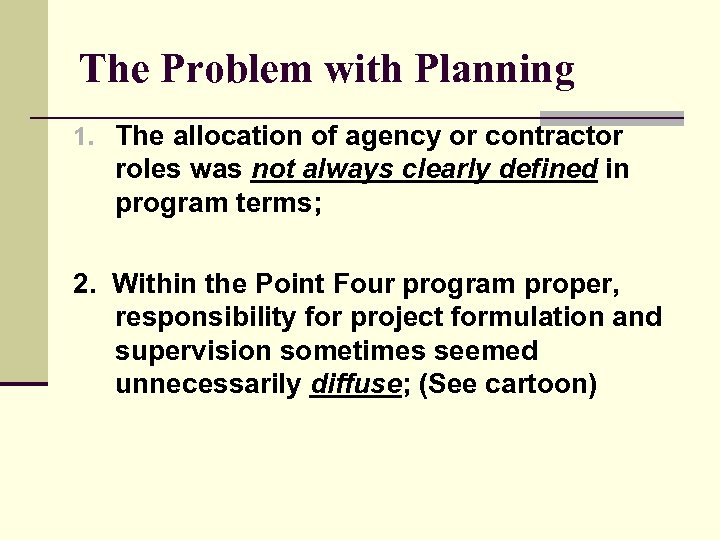 The Problem with Planning 1. The allocation of agency or contractor roles was not always clearly defined in program terms; 2. Within the Point Four program proper, responsibility for project formulation and supervision sometimes seemed unnecessarily diffuse; (See cartoon)