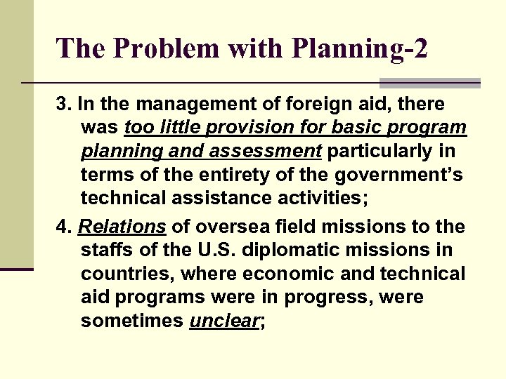 The Problem with Planning-2 3. In the management of foreign aid, there was too little provision for basic program planning and assessment particularly in terms of the entirety of the government’s technical assistance activities; 4. Relations of oversea field missions to the staffs of the U. S. diplomatic missions in countries, where economic and technical aid programs were in progress, were sometimes unclear;