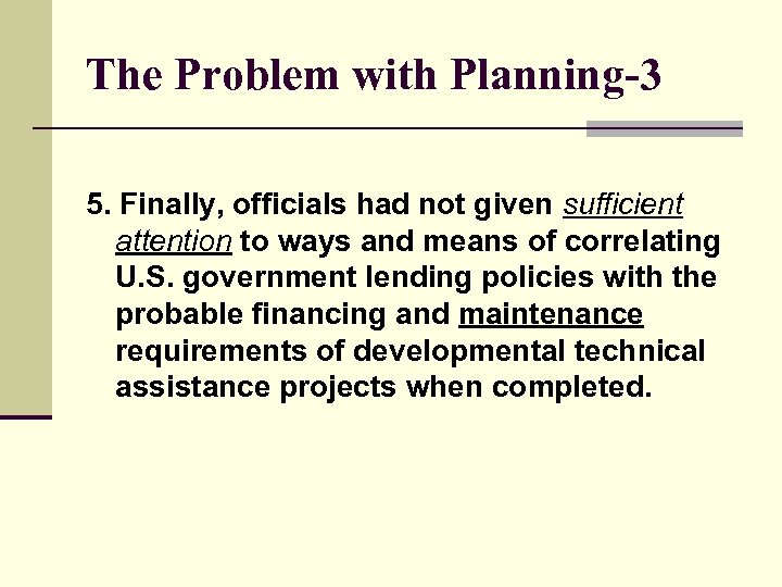 The Problem with Planning-3 5. Finally, officials had not given sufficient attention to ways and means of correlating U. S. government lending policies with the probable financing and maintenance requirements of developmental technical assistance projects when completed.