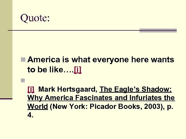 Quote: n America is what everyone here wants to be like…. [i] n [i] Mark Hertsgaard, The Eagle’s Shadow: Why America Fascinates and Infuriates the World (New York: Picador Books, 2003), p. 4.
