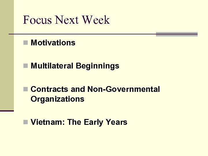 Focus Next Week n Motivations n Multilateral Beginnings n Contracts and Non-Governmental Organizations n Vietnam: The Early Years