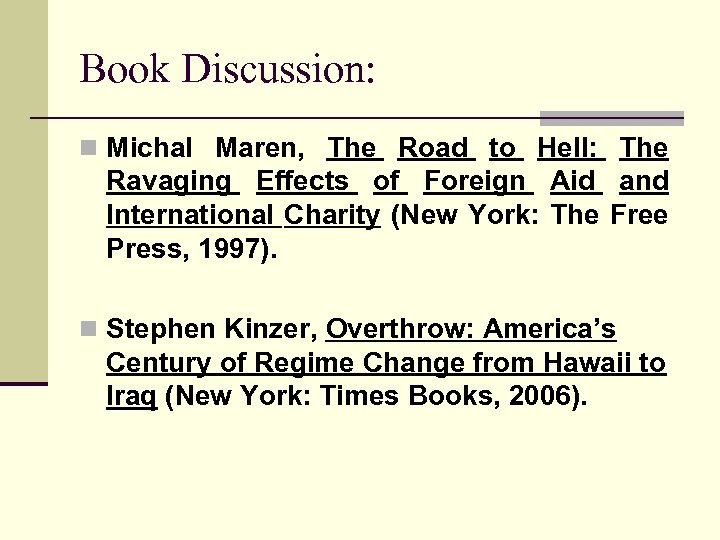 Book Discussion: n Michal Maren, The Road to Hell: The Ravaging Effects of Foreign Aid and International Charity (New York: The Free Press, 1997). n Stephen Kinzer, Overthrow: America’s Century of Regime Change from Hawaii to Iraq (New York: Times Books, 2006).