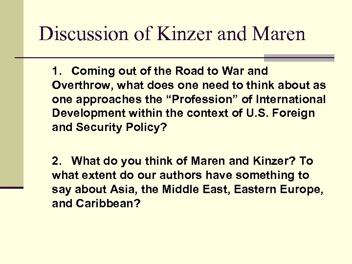 Discussion of Kinzer and Maren 1. Coming out of the Road to War and Overthrow, what does one need to think about as one approaches the “Profession” of International Development within the context of U. S. Foreign and Security Policy? 2. What do you think of Maren and Kinzer? To what extent do our authors have something to say about Asia, the Middle East, Eastern Europe, and Caribbean?