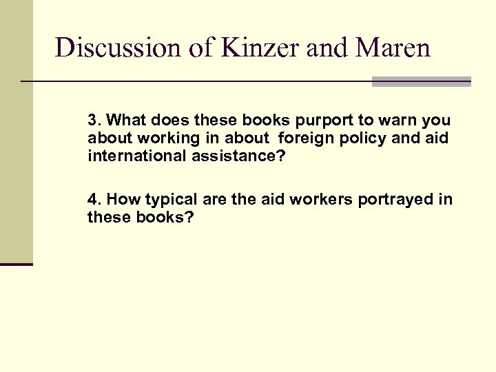 Discussion of Kinzer and Maren 3. What does these books purport to warn you about working in about foreign policy and aid international assistance? 4. How typical are the aid workers portrayed in these books?