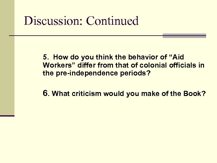 Discussion: Continued 5. How do you think the behavior of “Aid Workers” differ from that of colonial officials in the pre-independence periods? 6. What criticism would you make of the Book?