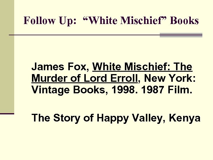 Follow Up: “White Mischief” Books James Fox, White Mischief: The Murder of Lord Erroll, New York: Vintage Books, 1998. 1987 Film. The Story of Happy Valley, Kenya