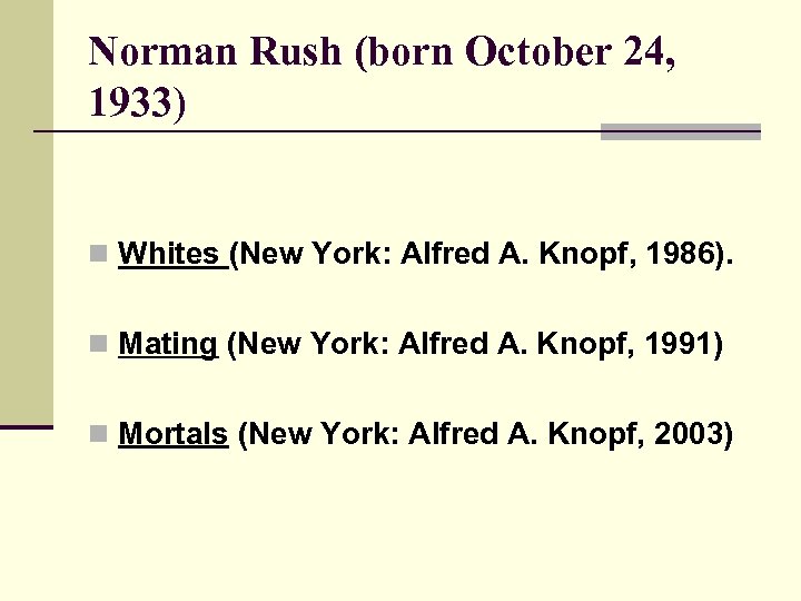 Norman Rush (born October 24, 1933) n Whites (New York: Alfred A. Knopf, 1986). n Mating (New York: Alfred A. Knopf, 1991) n Mortals (New York: Alfred A. Knopf, 2003)