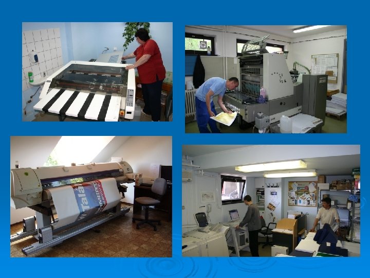 1. Nyomdai tevékenység: v v v A kis nyomdák kategóriájába tartozik. Közel két évtizedes nyomdai tapasztalattal rendelkezik. 1998. évben digitális gyorsmásoló berendezések, Priport beállításával. 2004. évben digitális színes nyomógép üzembe helyezése SRA/3 méretig XEROX 5252. 2005. SRA/3 méretig fekete-fehér színben bővítettük tevékenységünket XEROX 4590 -es géppel. 2008. évben 1643 mm széles és szinte korlátlan hosszú (50 m) plakátnyomó beszerzése, amely tetszés szerint egy vagy több színben, kültéri papír, kültéri öntapadó (fehér és átlátszó) és vinil alapú anyagra is nyomtat. Lehetőség van a kinyomott anyagok fóliázására is. Számítógépes kiadványszerkesztés, magas és ofszet nyomógépek B/2 méretig. Egyszerű és kis példányszámú munkák mellett nagysorozatú, négyszín nyomással is rendelkezésére állunk ügyfeleinknek. Korszerű digitális nyomdai berendezésekkel rendelkezünk. Teljeskörű nyomdai előkészítés kialakított. A névjegykártya mérettől a nagyplakát méretig (B/2–A/0) vállalunk, bel- és kültéri médiára történő nyomtatást. Könyvkötészetünkben lehetőséget biztosítunk fóliázott, spirálozott, tűzött és ragasztott kötésű kiadványok elkészítésére. Kis példányszámú könyvek keményfedelű kivitelezését is vállaljuk.