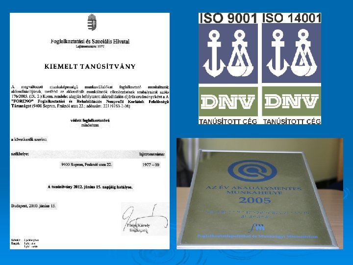 Tanúsítványok, elismerések: § § § § 2003 -ban ISO 9001: 2000 szabvány szerinti tanúsítást szerzett a cég 2005 -ben elnyerte az intézet a Foglalkozáspolitikai és Munkaügyi Minisztérium által kiírt „Az év akadálymentes munkahelye 2005 díjat!” 2006 -ban targonca vezető képzés Sztáv Zrt. „Lépj egyet előre” program keretében A Szociális és Munkaügyi Minisztériummal 2007– 2010 -re Védett szervezeti szerződést kötöttünk. Így biztosítottá vált 130 fő munkaviszonyban való foglalkoztatása a nehéz piaci körülmények között is. 2009 -ben Integrált Minőség- és Környezetirányítási Rendszer tanúsítása (ISO 9001: 2008; ISO 14001: 2004) szabványok szerint 2010. június: Kiemelt akkreditációs tanúsítványt kapott intézményünk. Védett műhely