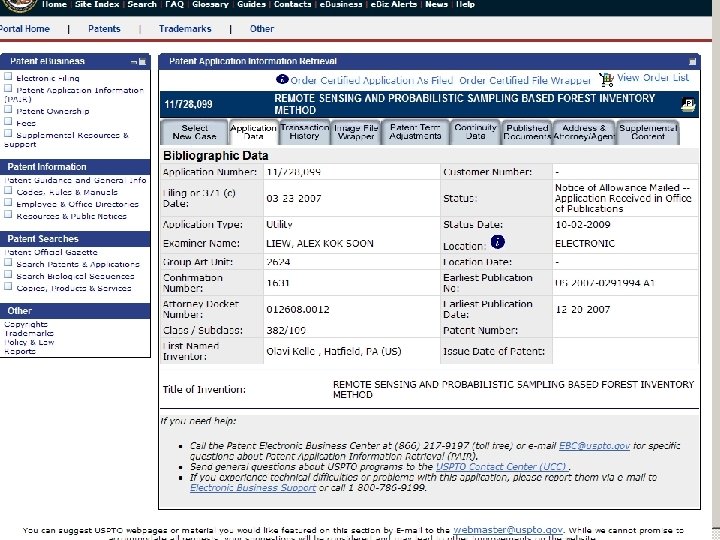 Kelle, O. , Macom, E. , Pliszka, R. , and N. Mathawan Priority Date 2006. 19 Regular Application Title Remote Sensing and Probabalistic Sampling Based Forest Inventory Method. Date Filed on March 23, 2007 What This application claims the priority of the earlier provisional application. The subject matter is little changed. Now claims are stated. Literature Flewelling (2006) Flewelling (2008) at Silvilaser 2008 Flewelling (2009)