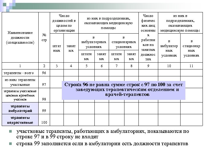 Наименование должности (специальности) Число должностей в целом по организации № стр в амбулаторных условиях в стационарных условиях штатн ых занят ых Число физичес ких лиц основны х работни ков на занятых должнос тях из них в подразделениях, оказывающих медицинскую помощь: в амбулатор ных условиях в стационар ных условиях штат ных занят ых 2 3 4 5 6 7 8 9 10 11 терапевты - всего 96 из них: терапевты участковые 97 терапевты участковые цеховых врачебных участков 98 терапевты амбулаторий 99 терапевты подростковые 100 1 n n Строка 96 не равна сумме строк с 97 по 100 за счет заведующих терапевтическим отделением и врачей-терапевтов участковые терапевты, работающих в амбулаториях, показываются по строке 97 и в 99 строку не входят строка 99 заполняется если в амбулатории есть должности терапевтов