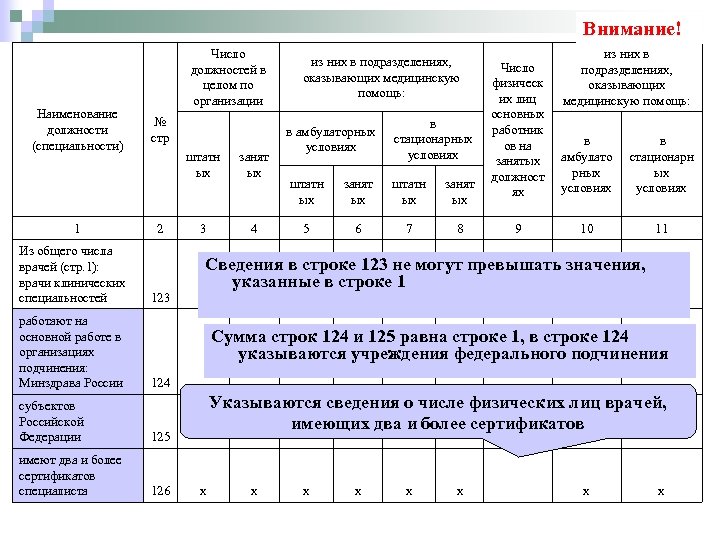 Внимание! Наименование должности (специальности) 1 Из общего числа врачей (стр. 1): врачи клинических специальностей работают на основной работе в организациях подчинения: Минздрава России Число должностей в целом по организации № стр штатн ых 2 123 занят ых 3 4 из них в подразделениях, оказывающих медицинскую помощь: в амбулаторных условиях в стационарных условиях штатн ых занят ых 5 6 7 8 из них в подразделениях, оказывающих медицинскую помощь: Число физическ их лиц основных работник ов на занятых должност ях в амбулато рных условиях в стационарн ых условиях 9 10 11 Сведения в строке 123 не могут превышать значения, указанные в строке 1 Сумма строк 124 и 125 равна строке 1, в строке 124 указываются учреждения федерального подчинения 124 субъектов Российской Федерации 125 имеют два и более сертификатов специалиста 126 х Указываются сведения о числе физических лиц врачей, имеющих два и более сертификатов х х х х