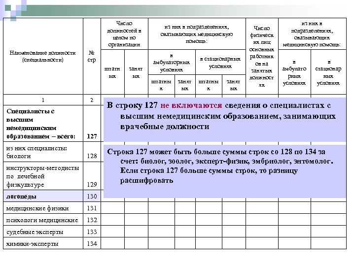 Число должностей в целом по организации Наименование должности (специальности) № стр штатн ых 1 2 Специалисты с высшим немедицинским образованием – всего: 127 из них специалисты: биологи 128 инструкторы-методисты по лечебной физкультуре 129 логопеды занят ых 3 из них в подразделениях, оказывающих медицинскую помощь: в амбулаторных условиях в стационарных условиях из них в подразделениях, оказывающих медицинскую помощь: Число физическ их лиц основных работник ов на занятых должност ях в амбулато рных условиях в стационар ных условиях штатны х занят ых 4 5 6 7 8 9 10 11 В строку 127 не включаются сведения о специалистах с высшим немедицинским образованием, занимающих врачебные должности Строка 127 может быть больше суммы строк со 128 по 134 за счет: биолог, зоолог, эксперт-физик, эмбриолог, энтомолог. Если строка 127 больше суммы строк, то разницу расшифровать 130 медицинские физики 131 психологи медицинские 132 судебные эксперты 133 химики-эксперты 134