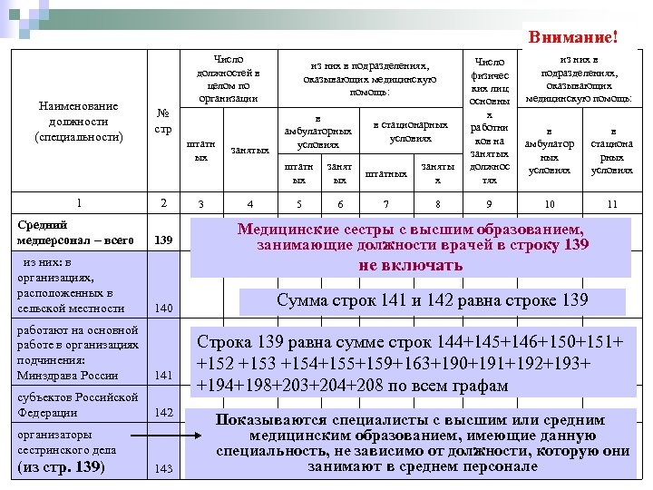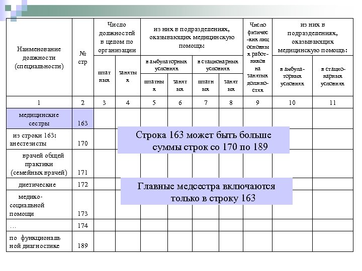 Наименование должности (специальности) № стр Число должностей в целом по организации штат ных заняты х в амбулаторных условиях в стационарных условиях штатны х занят ых штатн ых занят ых Число физичес -ких лиц основны х работников на занятых должностях из них в подразделениях, оказывающих медицинскую помощь: в амбулаторных условиях в стационарных условиях 1 2 3 4 5 6 7 8 9 10 11 медицинские сестры 163 Строка 163 может быть больше суммы строк со 170 по 189 из строки 163: анестезисты 170 врачей общей практики (семейных врачей) 171 диетические 172 медикосоциальной помощи 173 … 174 по функциональ ной диагностике 189 Главные медсестра включаются только в строку 163
