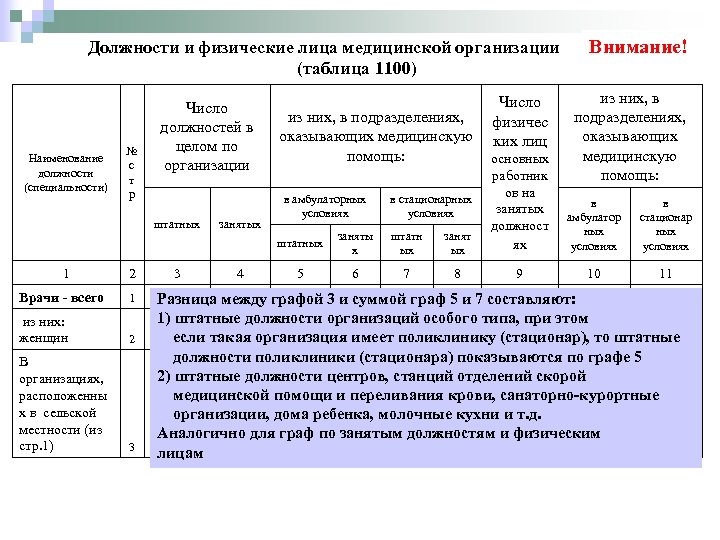 Должности и физические лица медицинской организации (таблица 1100) № с т р Число должностей в целом по организации из них, в подразделениях, оказывающих медицинскую помощь: Число физичес ких лиц штатных Наименование должности (специальности) штатных 1 2 Врачи - всего 1 из них: женщин 2 В организациях, расположенны х в сельской местности (из стр. 1) 3 3 занятых 4 заняты х штатн ых занят ых основных работник ов на занятых должност ях 5 6 7 8 9 в амбулаторных условиях в стационарных условиях Внимание! из них, в подразделениях, оказывающих медицинскую помощь: в амбулатор ных условиях в стационар ных условиях 10 11 Разница между графой 3 и суммой граф 5 и 7 составляют: 1) штатные должности организаций особого типа, при этом если такая организация имеет поликлинику (стационар), то штатные х х х х должности поликлиники (стационара) показываются по графе 5 2) штатные должности центров, станций отделений скорой медицинской помощи и переливания крови, санаторно-курортные организации, дома ребенка, молочные кухни и т. д. Аналогично для граф по занятым должностям и физическим лицам